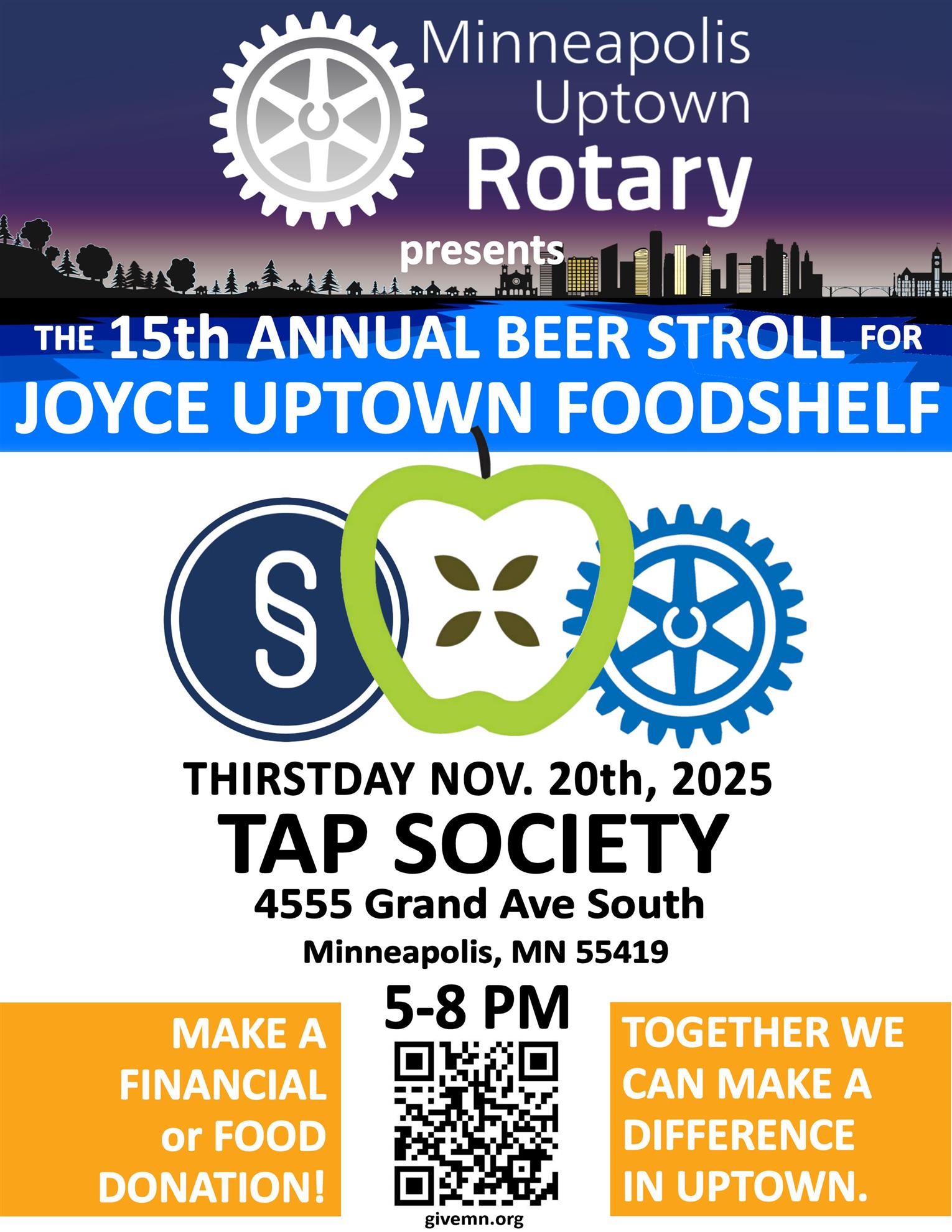 Our club is making difference by providing food for Minnesotans--specifically for the Joyce Uptown Food Shelf which largely services Uptown and South Minneapolis. Please! We would love for you to join us at OUR ANNUAL BEER STROLL on Thirstday, November 20th, 2025 at Tap Society (details below) and enjoy a beer or other beverage with our club to support the Shelf!